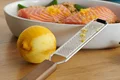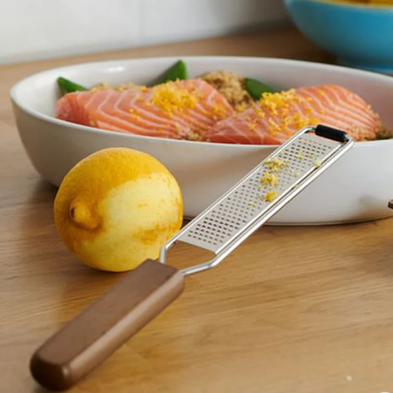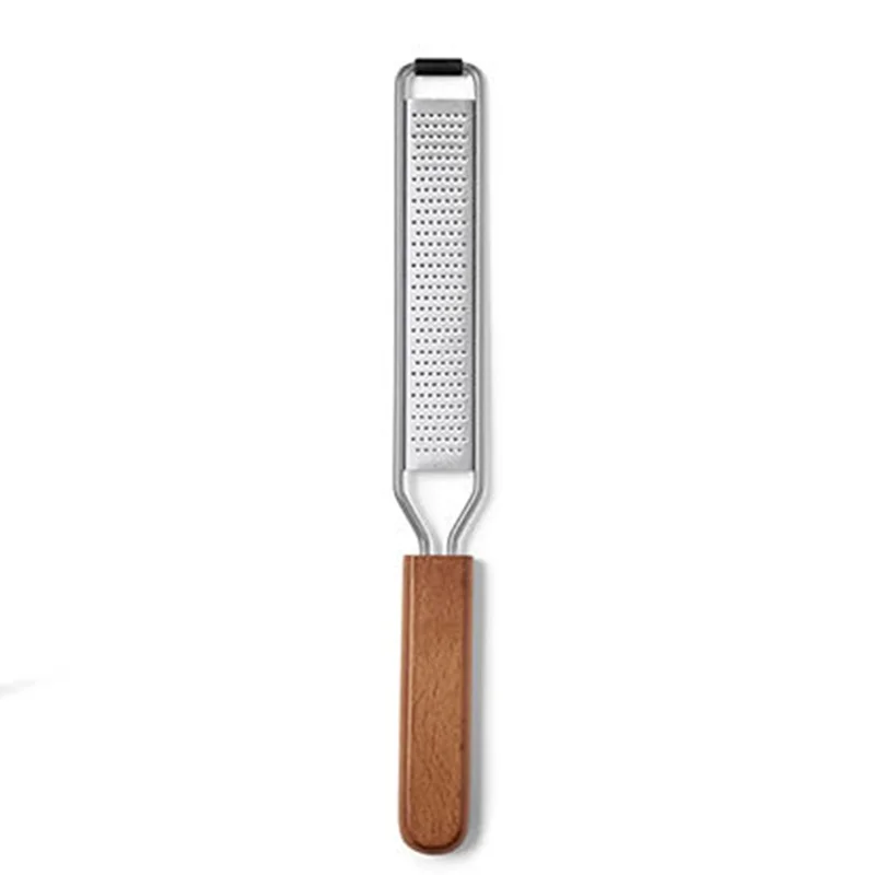 این رنده چیبو یک ابزار کارآمد و کاربردی برای آشپزخانه است، طول کلی آن حدود 29 سانتیمتر میباشد، دارای یک سطح تراش که حدود 3.5 در 15 سانتیمتر است و دستهی آن حدود 2.5 در 11 سانتیمتر است. این رنده دارای یک پایه از استیل ضد زنگ با پوشش سیلیکون ضد لغزش است که برای قرار دادن روی سطوح کاری و در کاسهها بسیار مناسب است. دستهی آن از چوب بلوط ساخته شده است.این رنده برای تراشیدن میوه، مرکبات، سبزیجات، پنیر سخت و شکلات ایدهآل است و دارای تیغههای ویژهای با تیزی بسیار بالا میباشد. این وسیله آشپزخانه از جنس استیل ضد زنگ با کیفیت بالا ساخته شده است و از باتری برای عملکرد آن استفاده نمیشود. توجه: این محصول بدون جعبه ارائه میشود.