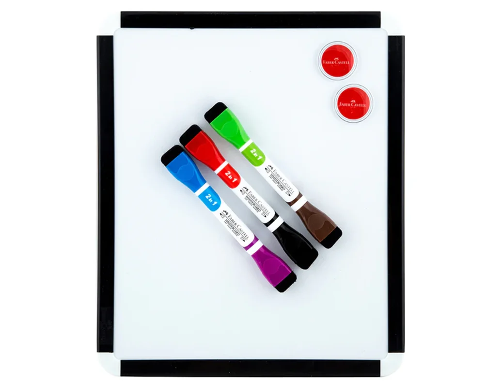 این وایتبرد اورجینال فابرکستل کوچک ایدهآل برای یادداشت کردن افکار، تاریخها، کارها و لیست خرید است و میتواند یک نجاتدهنده واقعی در زندگی روزمره باشد! این محصول با دو آهنربای قوی عرضه میشود که به شما کمک میکند هیچ کدام از یادداشتهای مهم خود را گم نکنید. همچنین شامل سه ماژیک وایتبرد دو سر با رنگهای مختلف در هر انتها است. هر درپوش ماژیک دارای یک آهنربا و یک پاککن نمدی است، بنابراین تمیز کردن وایتبرد پس از استفاده بسیار آسان خواهد بود.