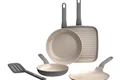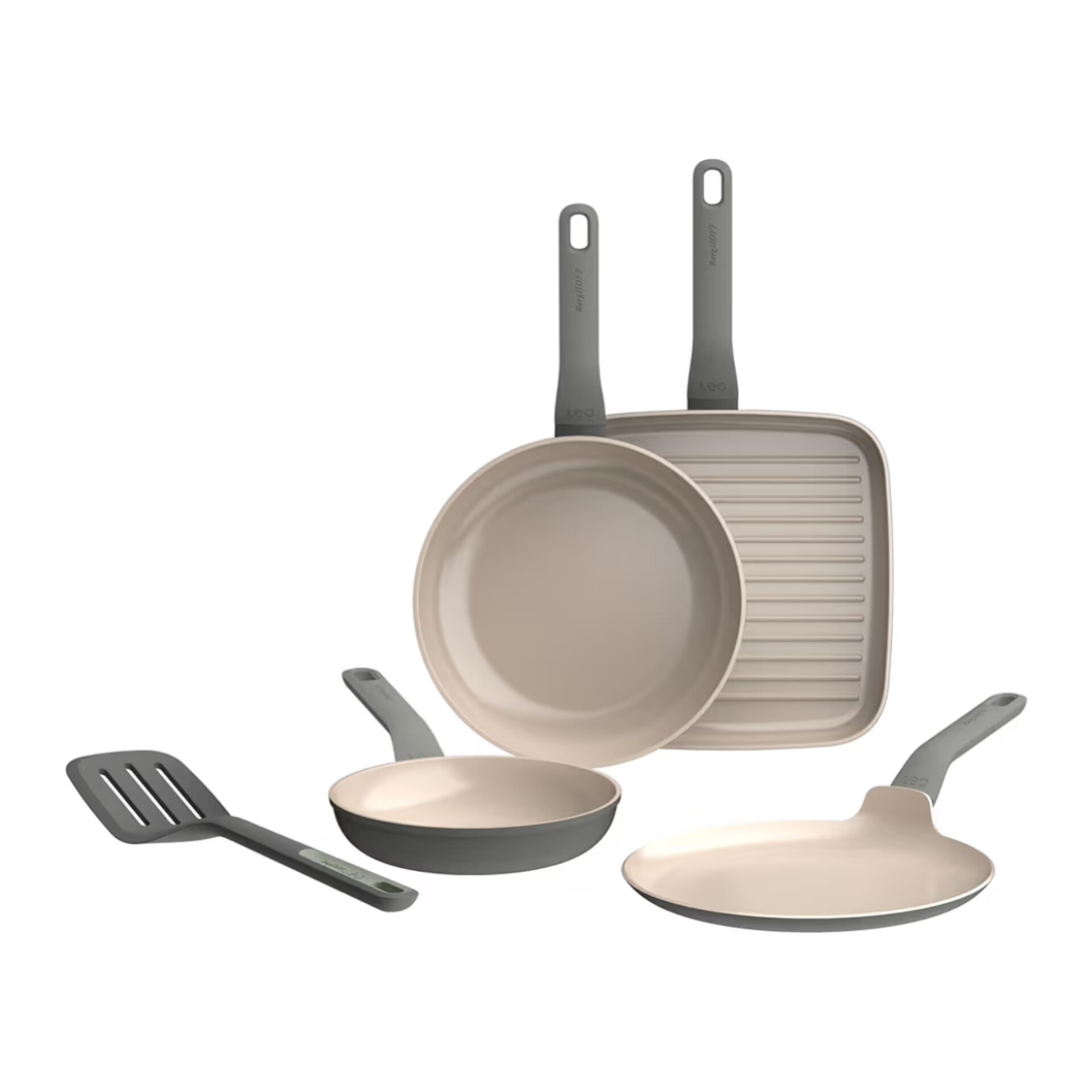 ست پنجتکه ماهیتابه سرامیکی BergHOFF Leo Balance با طراحی مدرن Moonmist شامل دو ماهیتابه (۲۰ و ۲۴ سانتیمتر)، یک گریلپن ۲۴ سانتیمتری، یک پنکیکپن ۲۶ سانتیمتری و یک کفگیر نایلونی Balance است که با لبهای انعطافپذیر برای سر خوردن آسان زیر غذا و تیغهای پهن برای برگرداندن راحت طراحی شدهاند. این مجموعه با پوشش غیرسمی CeraGreen و بدنهای از آلومینیوم بازیافتی، پلیپروپیلن و ترموپلاستیک الاستومر، ضمن حفظ سلامت، دوستدار محیطزیست نیز هست. دستههای مقاوم از رزین فنولیک با قابلیت خنکماندن در حین پخت، ایمنی و راحتی را تضمین میکنند. مناسب برای تمام اجاقها از جمله القایی، با پوشش داخلی نچسب و بیرونی سیلیکونی پلیاستر، این ظروف بهراحتی تمیز میشوند و پخش یکنواخت حرارت را با پایه دیسکی کامل فراهم میکنند.