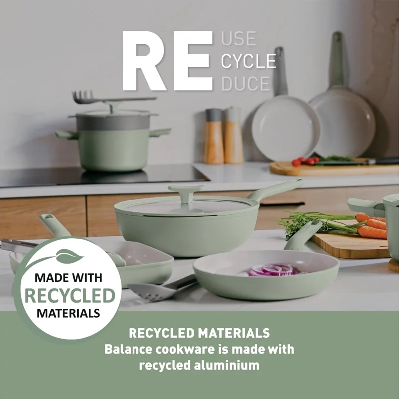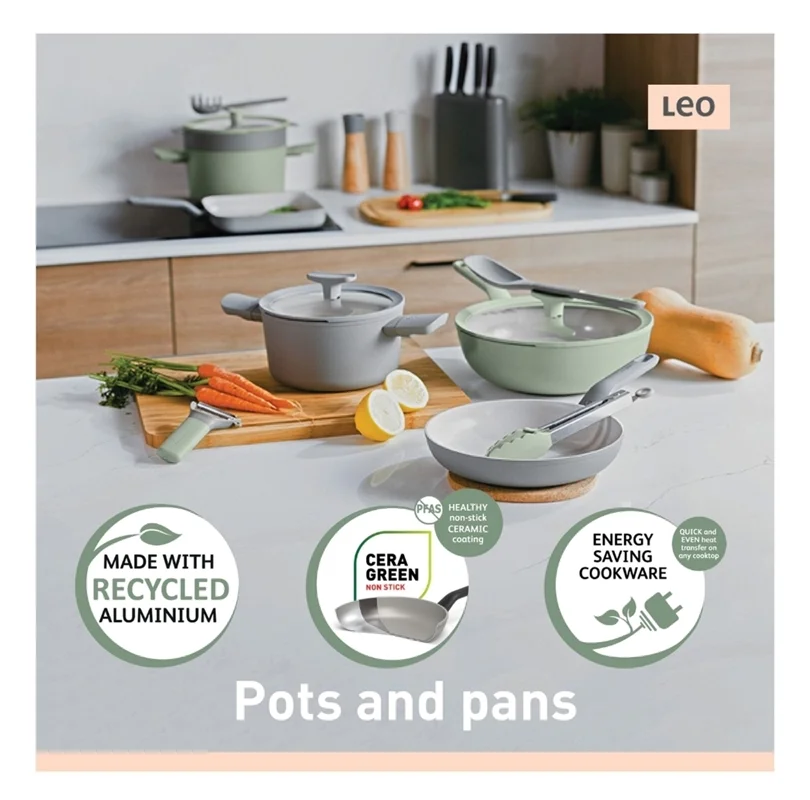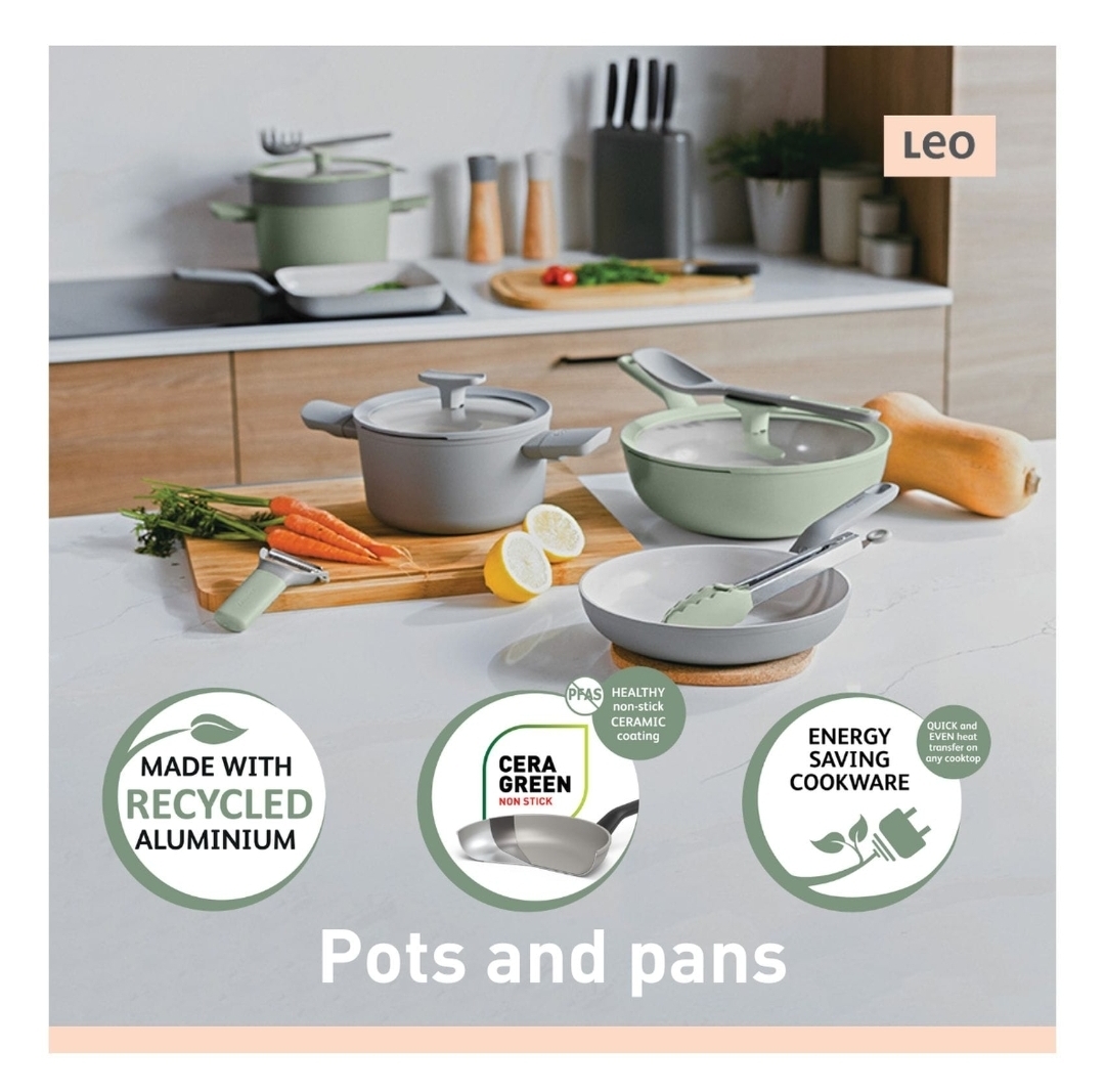 ست ۹ تکه BergHOFF Leo از جنس آلومینیوم دایکست با پوشش سرامیکی CeraGreen نچسب و بدون مواد سمی PFAS و PTFE ساخته شده و شامل ماهیتابههای ۸ و ۱۰ اینچی، قابلمه سس ۶.۲۵ اینچی با درب، قابلمه sauté ۱۰.۲۵ اینچی، قابلمه stockpot ۸ اینچی و بزرگ ۱۰ اینچی با درب میباشد. دستههای آن از رزین فنولیک و دارای طراحی Stay-cool برای ایمنی و راحتی هستند و دربها با لبه سیلیکونی برای جلوگیری از صدا و ریختن مایعات طراحی شدهاند. این ست با اجاقهای القایی، شیشهای، سرامیکی و گازی سازگار است، امکان شستوشوی آسان دارد (دستشویی توصیه میشود) و امکاناتی مانند سوراخ آبکشی یکپارچه و محل قرار دادن قاشق روی درب، کاربری راحت و آشپزی بدون بهمریختگی را فراهم میکند.