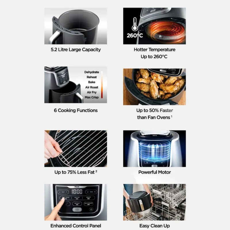 سرخکن نینجا مدل AF160ME یک دستگاه پیشرفته و با کارایی بالا است که برای پخت و پز با استفاده از تکنولوژی هوا، طراحی شده است. این سرخکن با قدرت 1750 وات و ظرفیت 5.2 لیتر، امکان تهیه غذاهای متنوع با حداقل میزان چربی را فراهم میکند و میتواند تا ۷۵٪ چربی کمتری نسبت به روشهای سنتی استفاده کند.این دستگاه دارای ۶ عملکرد پخت مختلف است که شامل سرخ کردن با هوا، کباب کردن، پختن، گرم کردن مجدد، خشک کردن و سرخ کردن شدید است. این ویژگیها به شما این امکان را میدهد تا غذاهای مختلفی را با استفاده از یک دستگاه تهیه کنید. طراحی مدرن و رنگ خاکستری این سرخکن، به همراه پایههای ضد لغزش، استفاده از آن را در آشپزخانه شما آسان و ایمن میکند. قطعات این دستگاه نیز قابل شستشو در ماشین ظرفشویی هستند که این امر نگهداری و تمیز کردن آن را بسیار ساده میسازد.ابعاد این سرخکن 36 سانتیمتر ارتفاع، 25 سانتیمتر عرض و 32 سانتیمتر عمق است و با وزنی حدود 5.2 کیلوگرم، جابجایی و قرار دادن آن در آشپزخانه آسان است. این دستگاه با ولتاژ 220-240 ولت و فرکانس 50-60 هرتز کار میکند و برای استفاده در آشپزخانههای خانگی طراحی شده است.