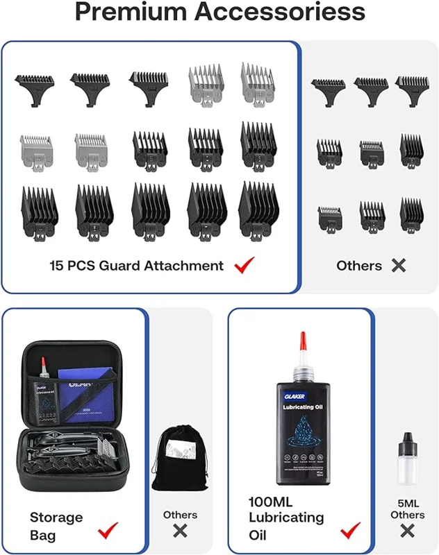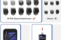 این مجموعه حاوی ۲۳ قطعه لوازم جانبی است که شامل روغن ضد زنگ 100 میلیلیتر، کیف حمل، ۱۲ عدد گارد ماشین اصلاح مو (از ۱.۵ تا ۲۵ و گاردهای گوش راست و چپ)، ۳ عدد گارد تریمر (2/3/4 میلیمتر)، لباس کوتاهی آرایشگر، شانه، دستمو، برس تمیز کننده و کابل USB میباشد.