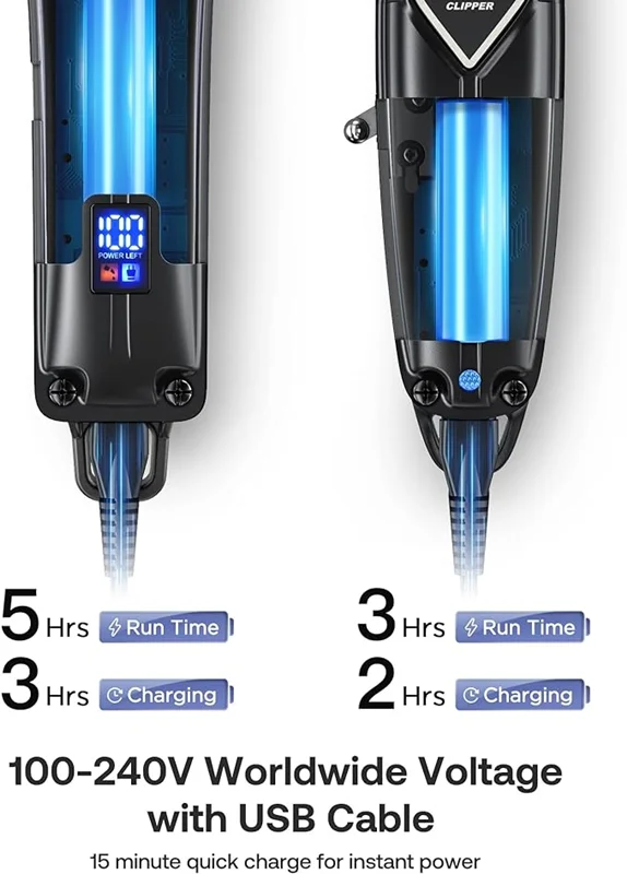 یکی از نکات ویژه این ماشین اصلاح مو، عمر باتری بسیار بلند آن است. این ماشین میتواند تا ۳۰۰ دقیقه پس از شارژ کامل به کار خود ادامه دهد که بعد از شارژ ۳ ساعته امکانپذیر است. صفحه نمایش LED نشان میدهد که چقدر باتری باقی مانده است، وضعیت شارژ و یادآوریهای روغنکاری. تریمر شکلدهنده هم میتواند تا ۱۸۰ دقیقه پس از شارژ کامل (۲ ساعت شارژ) عمل کند. هر دو ماشین اصلاح مو و تریمر پشتیبانی از استفاده با سیم و بیسیم را دارند.