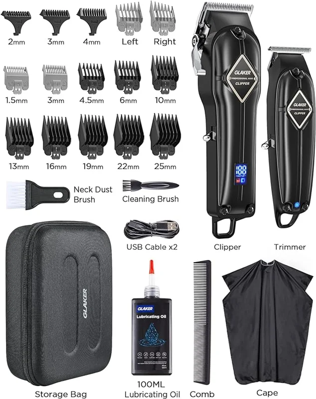 پک کامل اصلاح مردانه GLAKER شامل دو وسیله اصلی، یعنی ماشین اصلاح مو بیسیم و تریمر شکلدهنده است. ماشین اصلاح مو برای فید کردن و حالت دادن موها بسیار مناسب است و دارای یک دسته تنظیم فید قابل تنظیم و 15 عدد گارد است. همچنین، دارای باتری با عمر طولانی و صفحه نمایش LED برای نمایش وضعیت باتری و شارژ است. تریمر هم دارای باتری با طول عمر بالاست و هر دو وسیله از استفاده با سیم و بیسیم پشتیبانی میکنند. این مجموعه شامل 23 قطعه لوازم جانبی مانند گاردهای مختلف، روغن، کیف حمل و لوازم بهداشتی دیگر است.