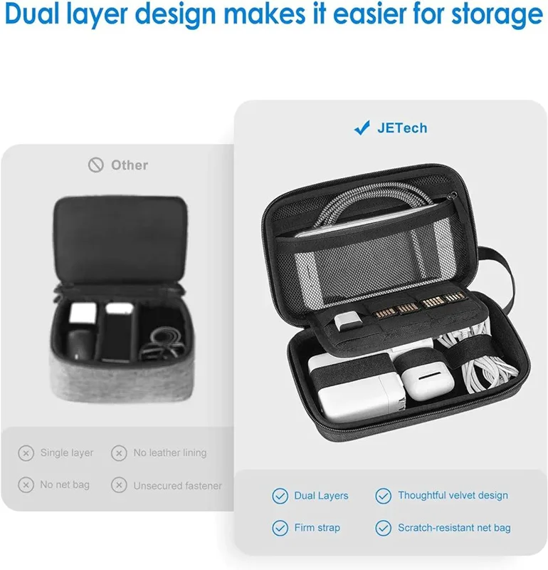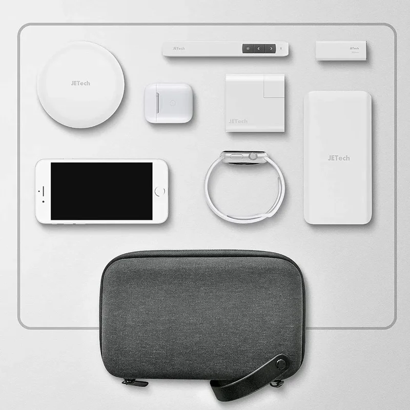کیف لوازم الکترونیک ، محصول دارای جنسی سه لایه می باشد که باعث ضد آب و ضد ضربه بودن آن شده است. این کیف مناسب نگهداری لوازم جانبی گوشی موبایل و خود گوشی موبایل است. وزن این کیف لوازم جانبی فقط 100 گرم است و طول آن 17 سانتیمتر است. انواع لوازم جانبی دیجیتال مانند پاوربانک، کابل شارژ، کابلهای صوتی و هندزفری در این کیف قرار میگیرند. یکی از وسایلی که بسیار پیش میآید گم شود فلش مموری است و باوجود طبقهبندی مطلوبی که در این کیف جادار وجود دارد دیگر این مشکل وجود نخواهد داشت. زیپهای آن مقاوم هستند و در دست گرفتن آن آسان است و به خاطر پارچهای بودن نمیشکند.