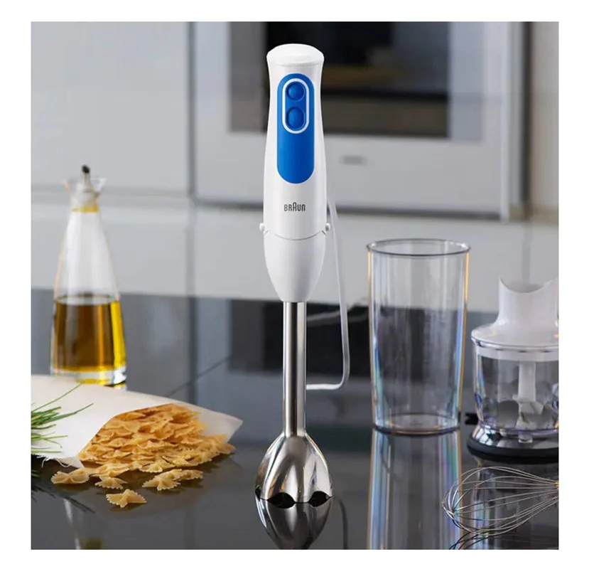 گوشکوب برقی Braun MultiQuick 3 مدل MQ3035 Sauce ترکیبی از قدرت، دقت و طراحی ارگونومیک است که آشپزی روزمره را به تجربهای حرفهای تبدیل میکند. این دستگاه با موتور قدرتمند ۷۰۰ وات و فناوری SplashControl از پاشش مواد جلوگیری کرده و محیطی تمیز را هنگام کار فراهم میسازد. تیغههای پیشرفتهی PowerBell Plus برش سریعتر و یکنواختتری ایجاد میکنند، در حالیکه دو سطح سرعت کنترل کاملی بر روی بافت مواد غذایی به شما میدهد. همراه با لیوان مدرج ۶۰۰ میلیلیتری بدون BPA، خردکن ۵۰۰ میلیلیتری و ویسک فلزی حرفهای، برای تهیهی انواع نوشیدنی، سس، خامه و خردکردن سبزیجات و مغزها کاملاً مناسب است. قطعات دستگاه بهراحتی در ماشین ظرفشویی قابل شستوشو هستند و طراحی سبک و خوشدست آن کار را لذتبخشتر میکند.